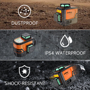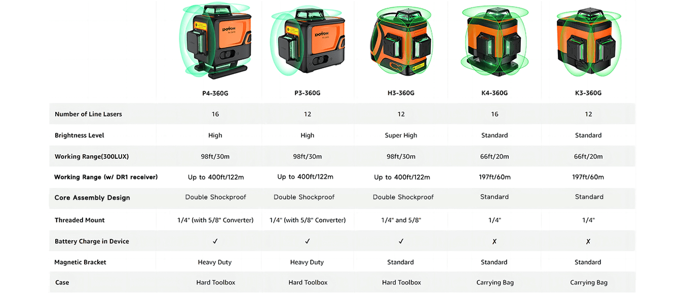 【Heavy Duty & Durable Design】 DOVOH P3-360G 3D laser level uses updated core assembly. It can handle impacts and vibrations without losing accuracy or functionality. Injection-molded rubber design reduces the risk of damage to the device. Metal protective cover protects the laser diode against damage from a drop.